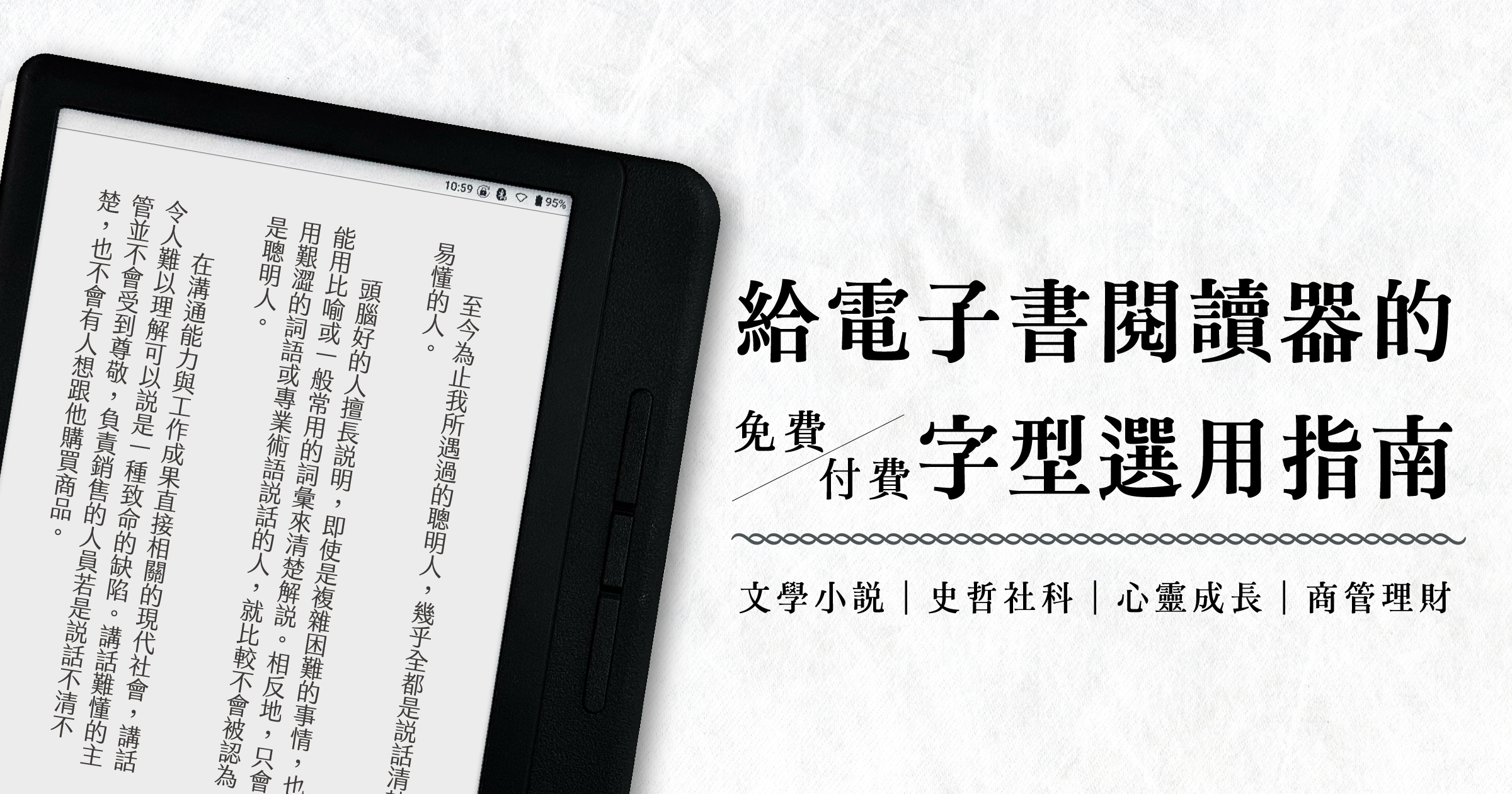 為了解決書櫃每年都爆炸的問題,我觀望許久終於在今年入手了電子書閱讀器。收到閱讀器,完成基本設定後,不是先開書,反而是先把想拿來看書的字體安裝好。雖然,紙本書的內頁排版是設計師和編輯的一番心意,不過挑選自己喜愛的字型讀喜歡的書,也是使用電子書的一大樂趣啊!