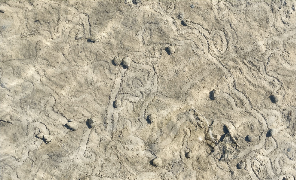 雖然福壽螺的特色鮮明,令人印象深刻,但田裡的螺可不只有福壽螺。依據福壽螺和石田螺的體型、爬行軌跡,Over 分別設計了兩款螺體——福壽螺(Pomacea)與石田螺(Sinotaia)。福壽螺身形較大,留下的痕跡自然比較寬;石田螺身形小,加上濾食的特性,留下的爬行痕跡因此較細且深。