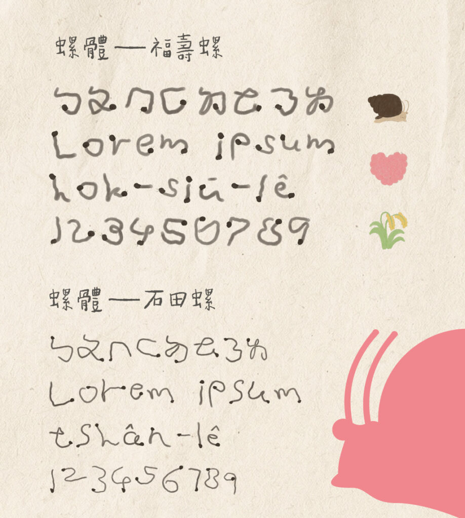 一套可應付日常生活使用的中文字型,至少需要 7,000 至 14,000 個字。這樣龐大的字數,無論對螺或是螺的最佳代言人 Over 來說,幾乎是不可能的挑戰。但若是注音,透過 37 個符號,也就可以間接傳遞中文含義。若加上字母、羅馬字,連英文和本土語言都可以呈現。終於,螺體的計劃就此正式開始!